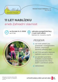 Domácí hospic Nablízku letos slaví 11 let své činnosti. Při této příležitosti zveme veřejnost na tradiční setkání na zahradě evangelické fary v Lysé nad Labem, které se uskuteční ve čtvrtek 14. května od 17.30 hodin.